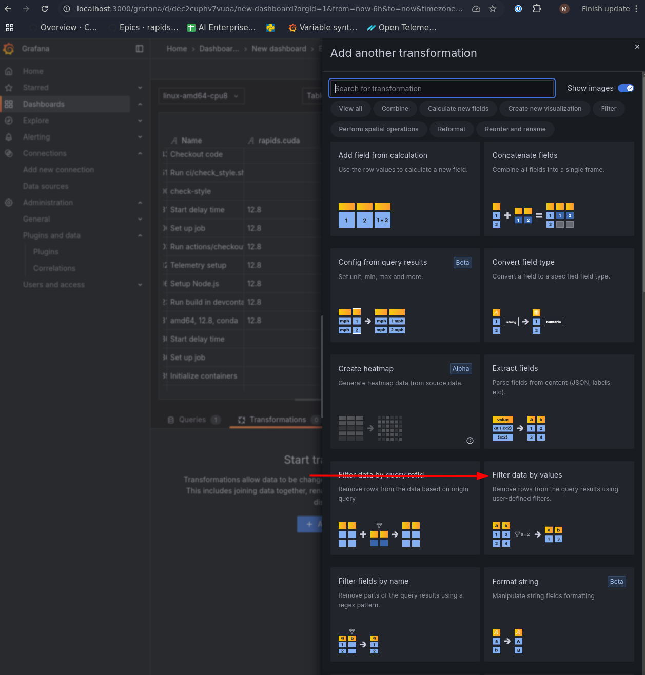 resource.rapids.labels- These are the labels of the kind of machine that was used for the job. This filter removes “in-between” jobs, such as the matrix computation, and can also distinguish between build and test jobs.
